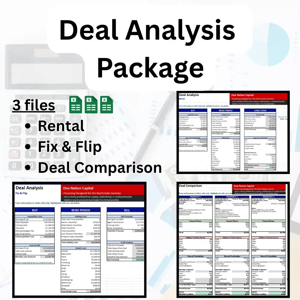 All files contain formulas that allow you to quickly and easily see all the critical numbers of a deal, so you can make the best investing decisions on home rentals and Fix & Flips