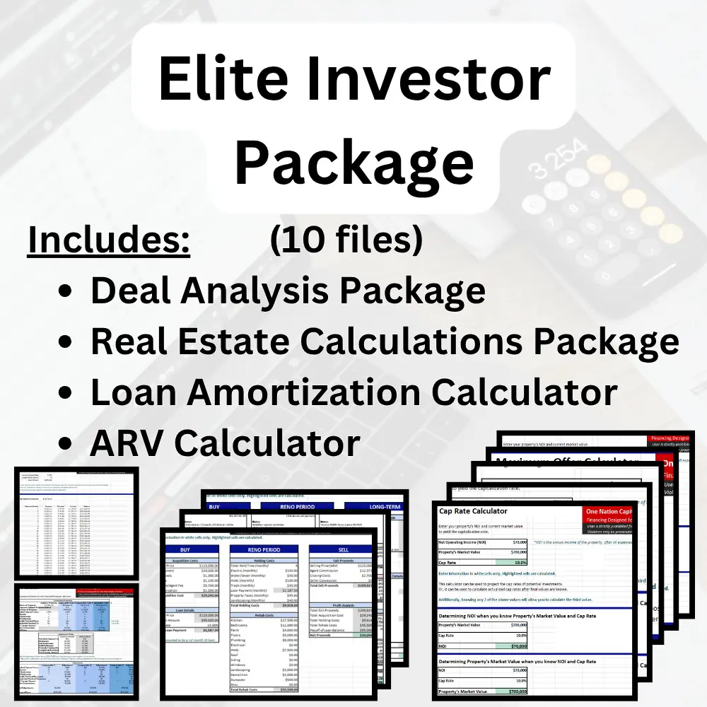 Store Elite Investor Package Yearly option $149/ year Buy Now Monthly option $15/ month Buy Now Deal Analysis Package Yearly option $99/ year Buy Now Monthly option $12/ month Buy Now ARV Calculator Only $39/ year Buy Now Loan Amortization Calculator Only $19/ year Buy Now Real Estate Calculations Package Only $19/ year Buy Now Online Course Only $199 Buy Now Leasing Documents Package Only $69 Buy Now Fix & Flip Project Analysis Only $39 Buy Now Rental Management Package Only $39 Buy Now Managing Contractors Package Only $19 Buy Now Real Estate Investing eBooks Package (5 eBooks) Only $19 Buy Now